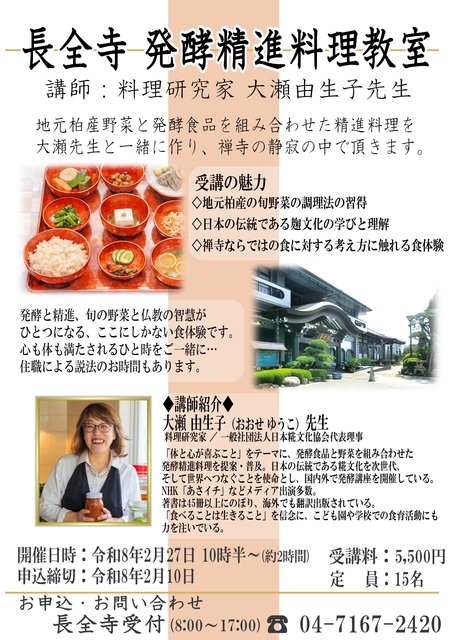 この度、料理研究家/一般社団法人:大瀬由生子先生と尊いご縁を頂き、当山客殿に於いて長全寺発酵精進料理教室を開催する運びとなりました。